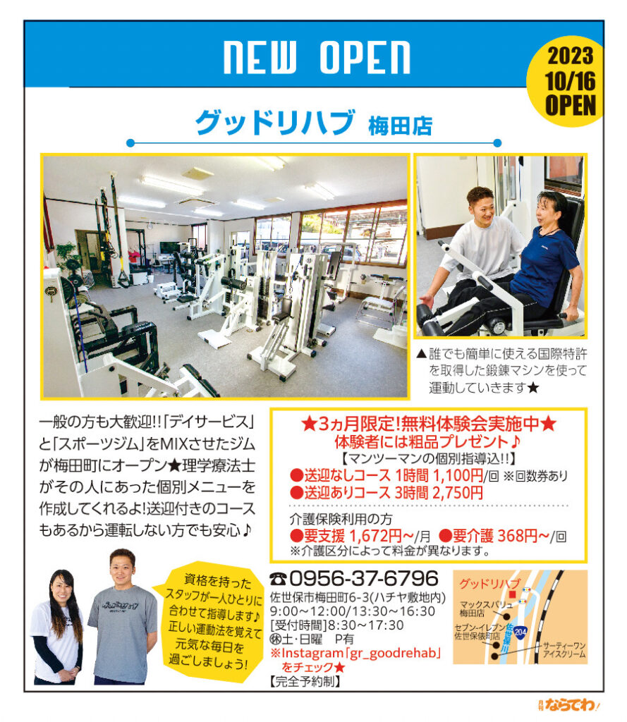 2023年10月、佐世保市梅田町に系列店のリハビリ特化型デイサービスがオープンしました。